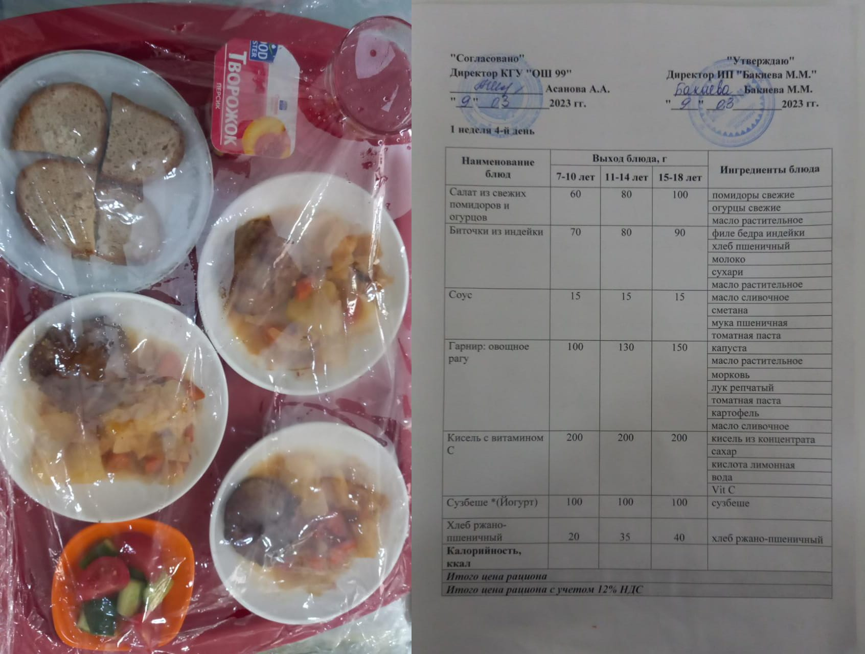 09 наурызға арналған ас мәзірі / Контрольное блюдо на 09 марта