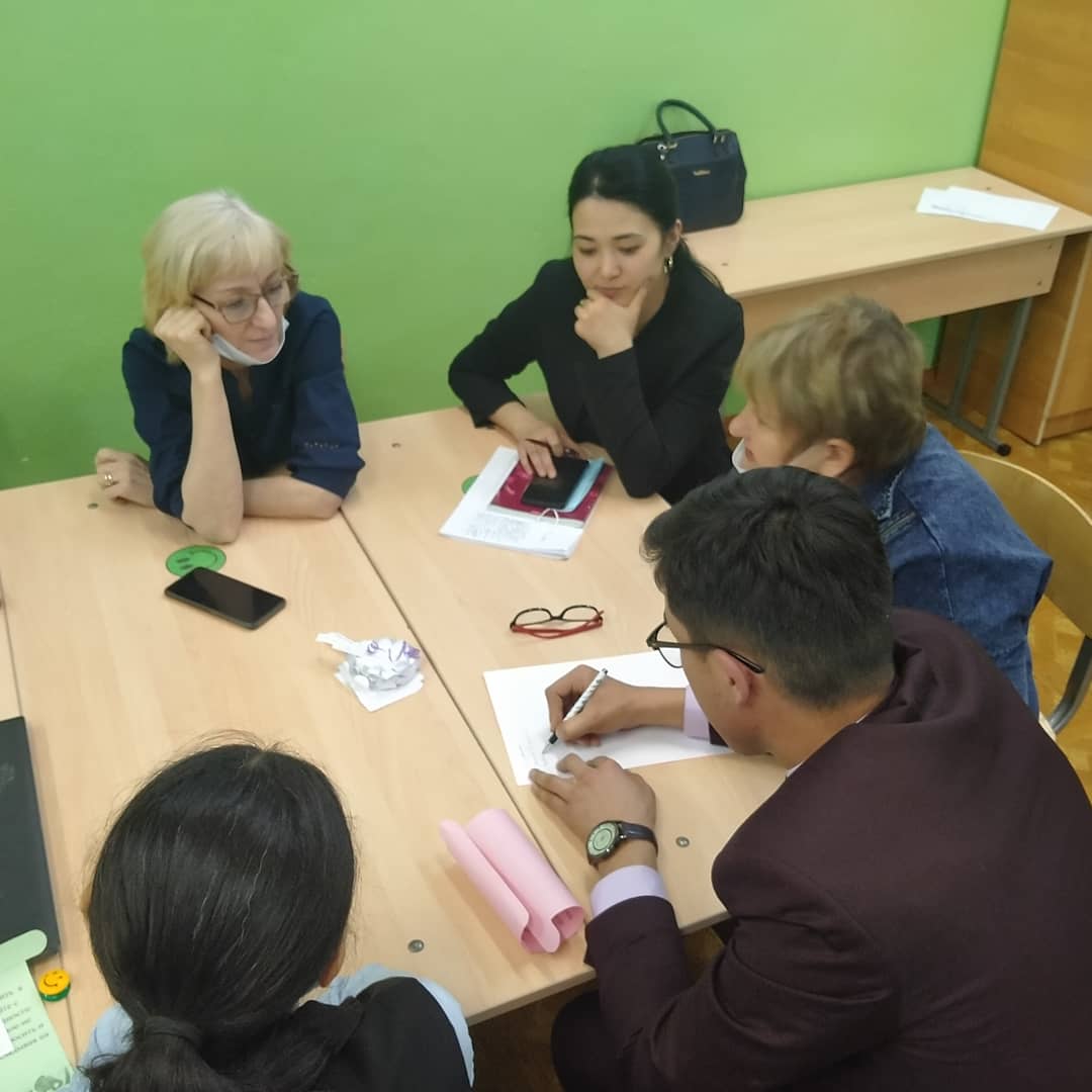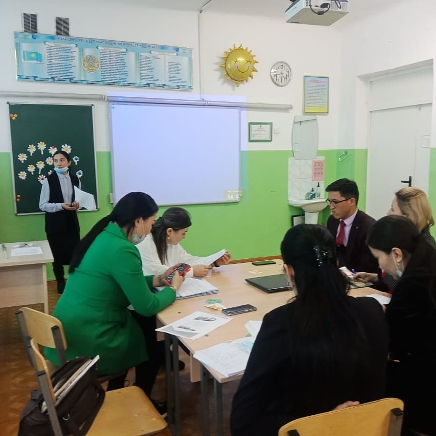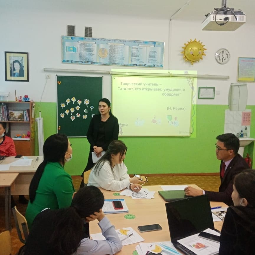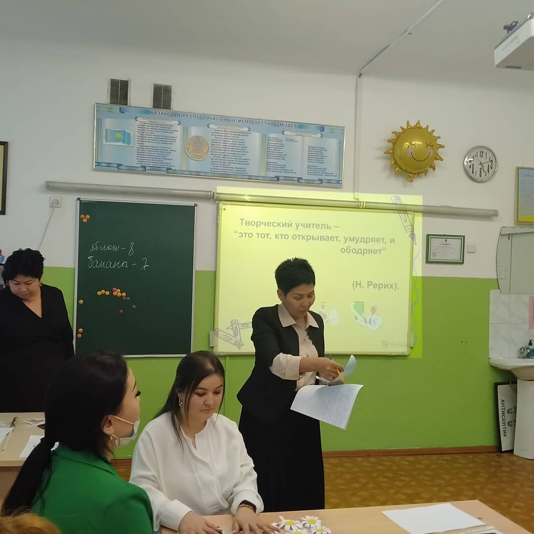 Первой выступила Ирискулова Э.А., которая в 9 «В» классе проводила урок казахского языка «Жасыл экономика» в форме «Путешествия в страну знаний», применила групповую форму работы, учащиеся составили пакет МОД. Урок прошел методически грамотно, дети были вовлечены в творческий процесс.