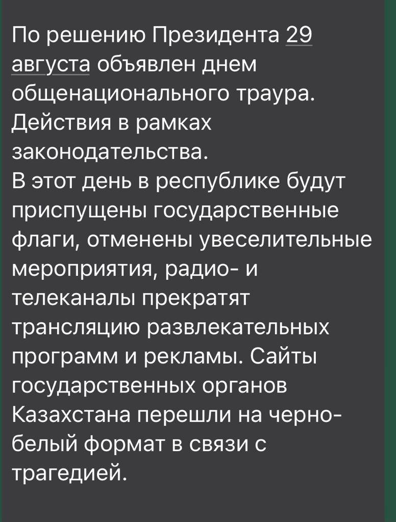28 тамыз 2021 0 1 2 3 4 5 29 августа 2021 объявлен днем общенационального траура в Республике Казахстан