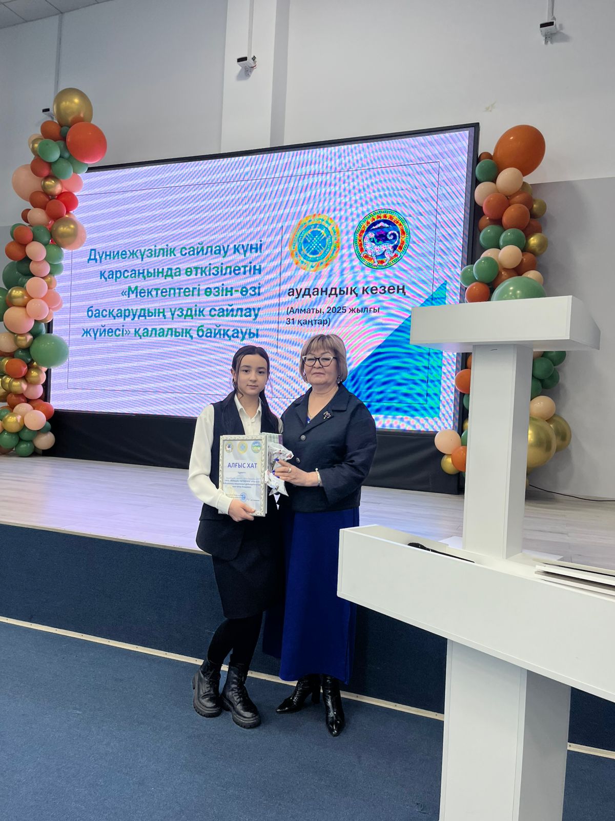 «Алматы дарын» орталығы Алматы қаласының аумақтық сайлау комиссиясының, ұйымдастыруымен өткен "Мектептің өзін-өзі басқару” үздік сайлау жүйесі байқауына мектебіміздің өзін - өзі басқару ұйымы қатысып, алғыс хатпен марапатталды .